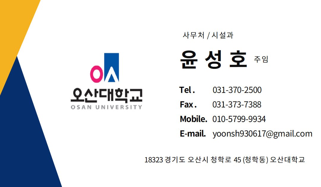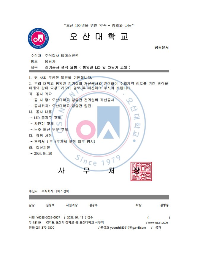 - 오산대학교 명의의 공문과 명함을 위조하여, 전기공사 견적을 요청하는 방식으로 이루어지고 있으며, 실제 우리 대학과는 무관한 사칭 행위