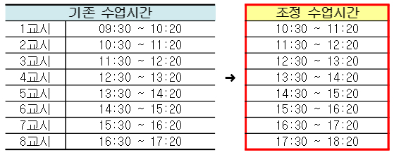 1) 수업시간: 주간수업 1교시 시작시간 조정, 09:30 ➜ 10:30